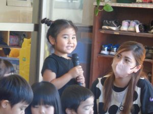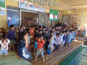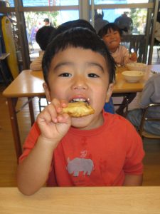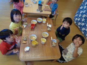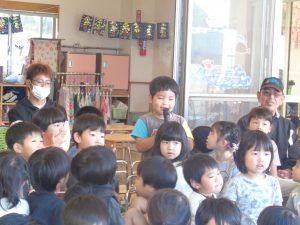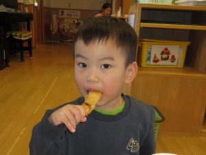 紙芝居には、魚だけではなく 鶏肉・豚肉・牛肉等にも命があるものを大切にいただく話をしました。小さい子には、分からない部分もあると思いますが、1歳児さんからも「さかなさかなさかな~さかなを食べるとからだからだからだ~からだにいいのさ~(^^♪」とかわいらしい歌声が聞こえ、今の年齢でわからなくても自然に分かってくる時がくるので、私たちは小さい時からの積み重ねを大切にしていきたいと思います。☆彡