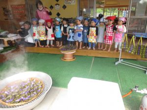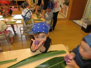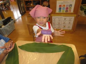 あおぞらの子保育園のムーチーは紅芋が、たーーーぷり入っていて、サイコーにおいしいムーチーです。